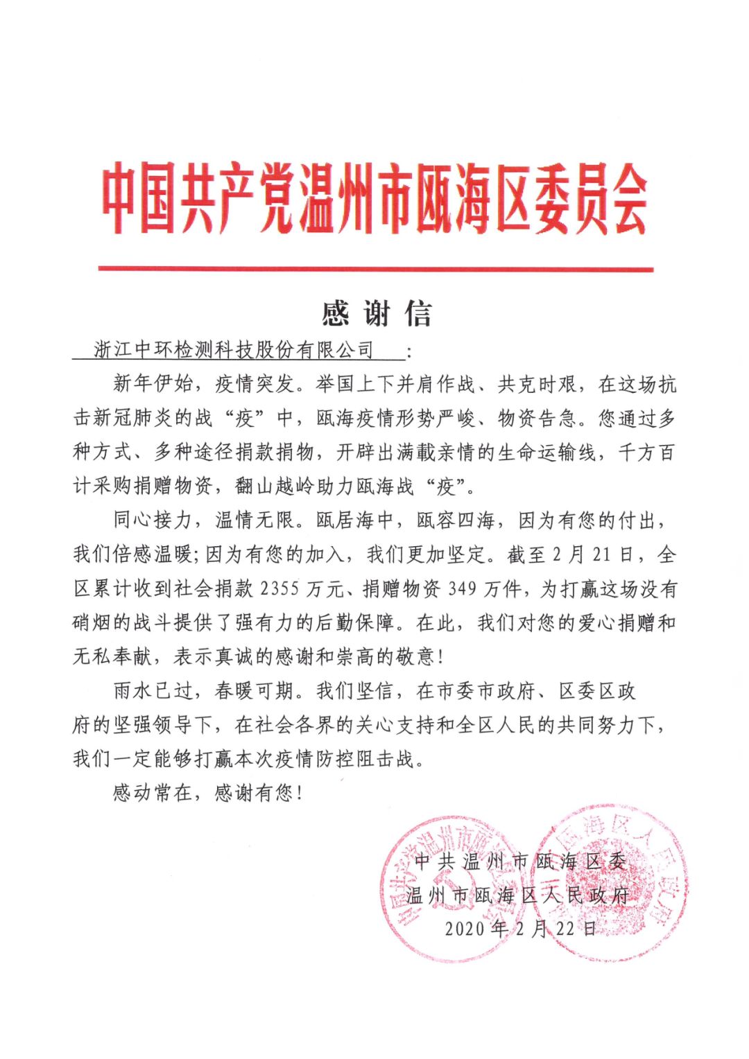 疫情发生至今,中环检测已捐赠“新生代疫情”慈善现金1万元,医用乳胶手套2万双、一次性医用口罩5000个、R95口罩2万个,并又捐赠各方一次性口罩32000个、护目镜及消毒水等物资,且为部分医院新建的临时放射场所,提供紧急放射检测评价服务。▼中共温州市瓯海区委、温州市瓯海区人民政府发来感谢信